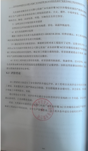 結(jié)論:大慶油田有限責(zé)任公司第七采油廠永樂(lè)油田葡362區(qū)塊葡萄花油層產(chǎn)能建設(shè)地面工程試運(yùn)行情況良好,安全生產(chǎn)管理有效,該工程具備申請(qǐng)安全驗(yàn)收的條件。