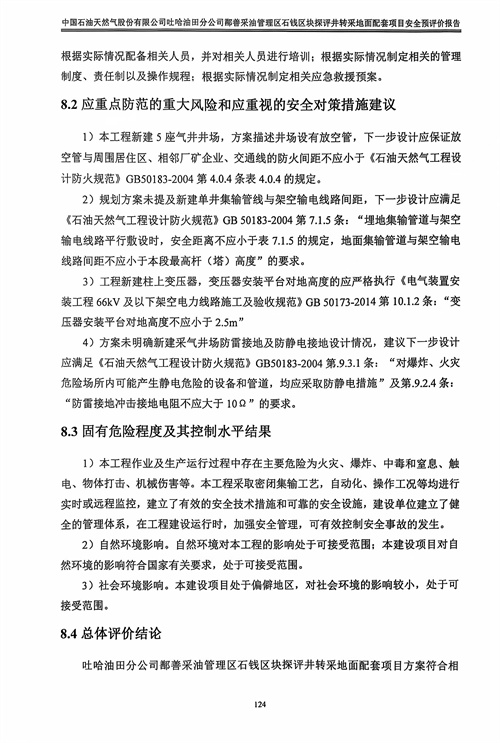 吐哈油田分公司鄯善采油管理區(qū)石錢區(qū)塊探評井轉(zhuǎn)采地面配套項目方案符合相關(guān)法律、法規(guī)及標(biāo)準(zhǔn)規(guī)范對安全生產(chǎn)的要求。建設(shè)單位應(yīng)在其今后的設(shè)計、施工和運行中進一步落實本工程方案提出的安全技術(shù)措施和本次預(yù)評價提出的補充安全措施,確實保證工程安全設(shè)施和主體工程的“三同時”,并在工程竣工投產(chǎn)后切實加強安全生產(chǎn)管理,以實現(xiàn)工程安全、平穩(wěn)運行,本項目危險有害因素能夠得到控制,建成投產(chǎn)后,能達(dá)到有關(guān)法律、法規(guī)及標(biāo)準(zhǔn)規(guī)定的安全要求。 |