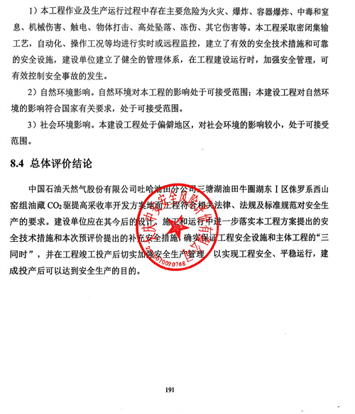 中國石油天然氣股份有限公司吐哈油田分公司三塘湖油田牛圈湖東Ⅰ區(qū)侏羅系西山窯組油藏CO2驅(qū)提高采收率開發(fā)方案地面工程符合相關(guān)法律、法規(guī)及標準規(guī)范對安全生產(chǎn)的要求。建設(shè)單位應(yīng)在其今后的設(shè)計、施工和運行中進一步落實本工程方案提出的安全技術(shù)措施和本次預(yù)評價提出的補充安全措施,確實保證工程安全設(shè)施和主體工程的“三同時”,并在工程竣工投產(chǎn)后切實加強安全生產(chǎn)管理,以實現(xiàn)工程安全、平穩(wěn)運行,建成投產(chǎn)后可以達到安全生產(chǎn)的目的。