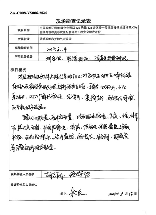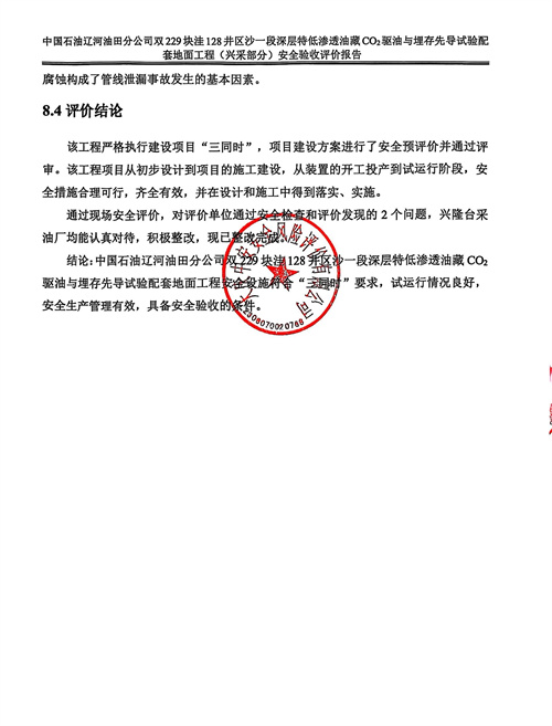 結(jié)論:中國(guó)石油遼河油田分公司雙229塊洼128井區(qū)沙一段深層特低滲透油藏CO2驅(qū)油與埋存先導(dǎo)試驗(yàn)配套地面工程安全設(shè)施符合“三同時(shí)”要求,試運(yùn)行情況良好,安全生產(chǎn)管理有效,具備安全驗(yàn)收的條件。